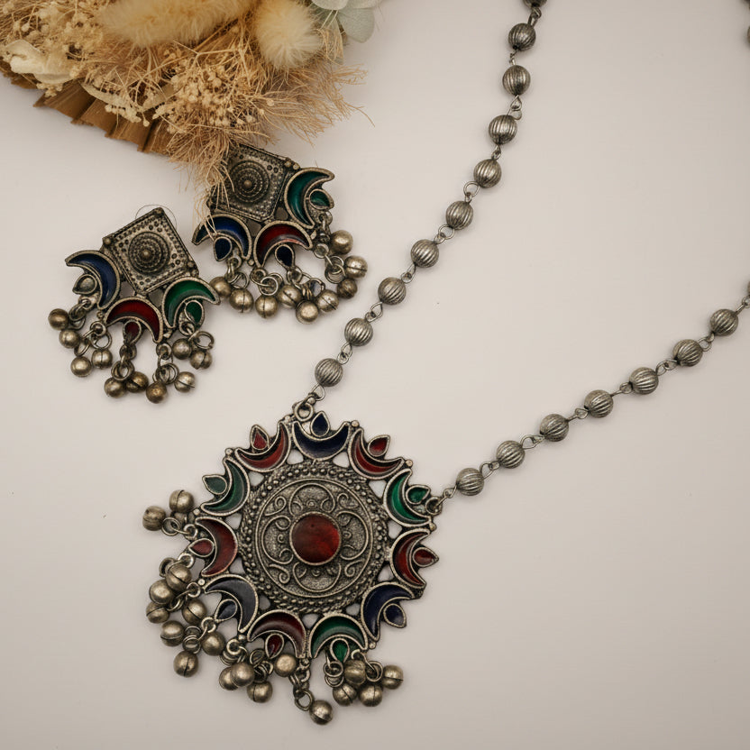 VALENCIE presents an exquisite German silver oxidised jewellery set featuring a coordinated necklace and earrings. The oxidised finish imparts a refined, antique-inspired aesthetic that exudes understated luxury.