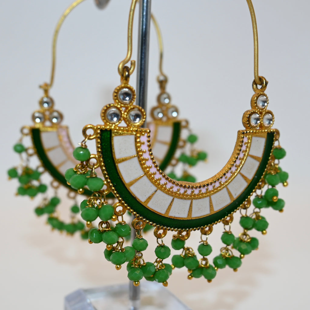 Introducing DARINA- the perfect fusion of chic and traditional style. These statement earrings feature stunning green and pastel meenakari work, adding a touch of boho flair to any outfit. Enhance your look with these eye-catching earrings.