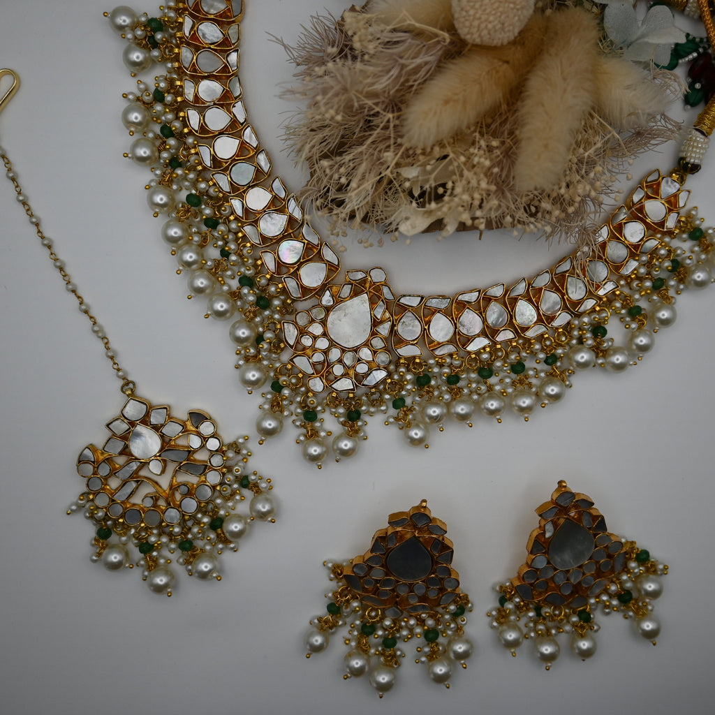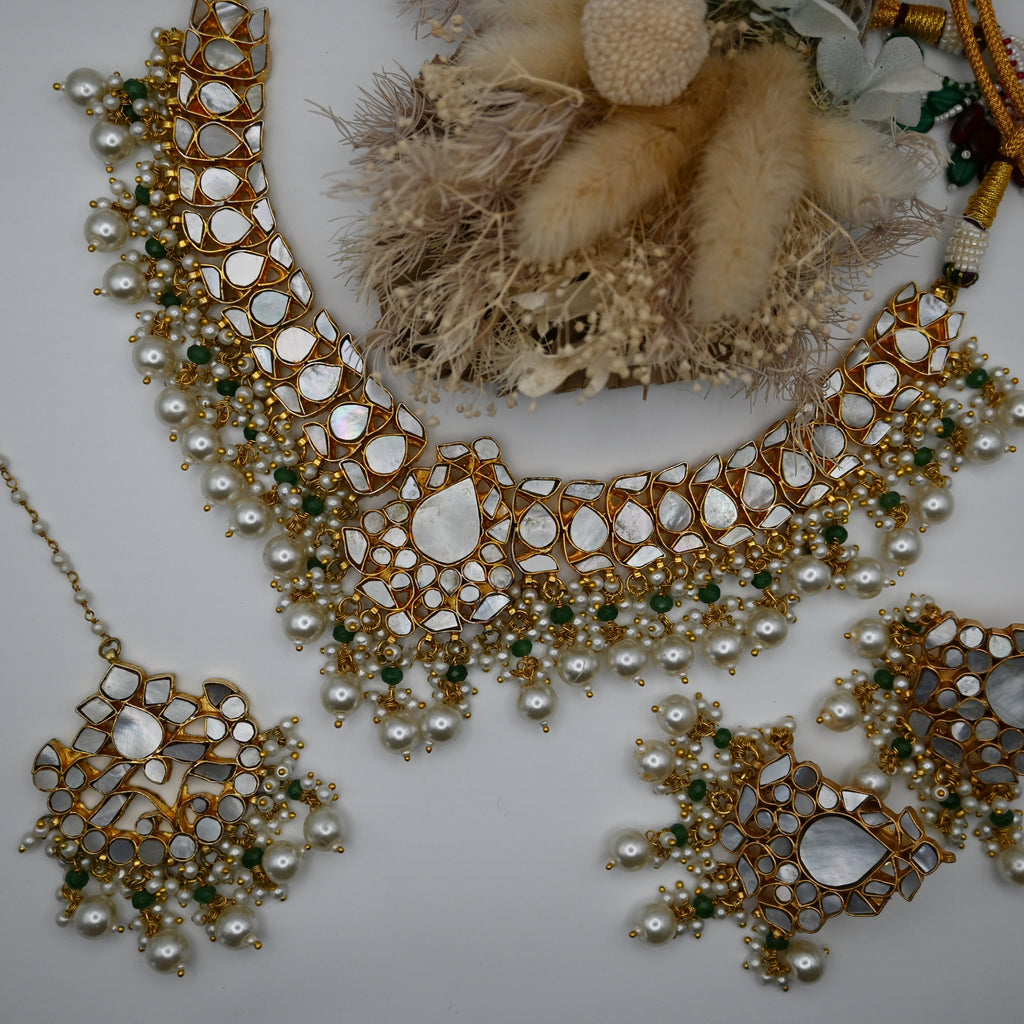 LOUVE- gold plated mother of pearl semi precious necklace set with matching mangtika and earrings