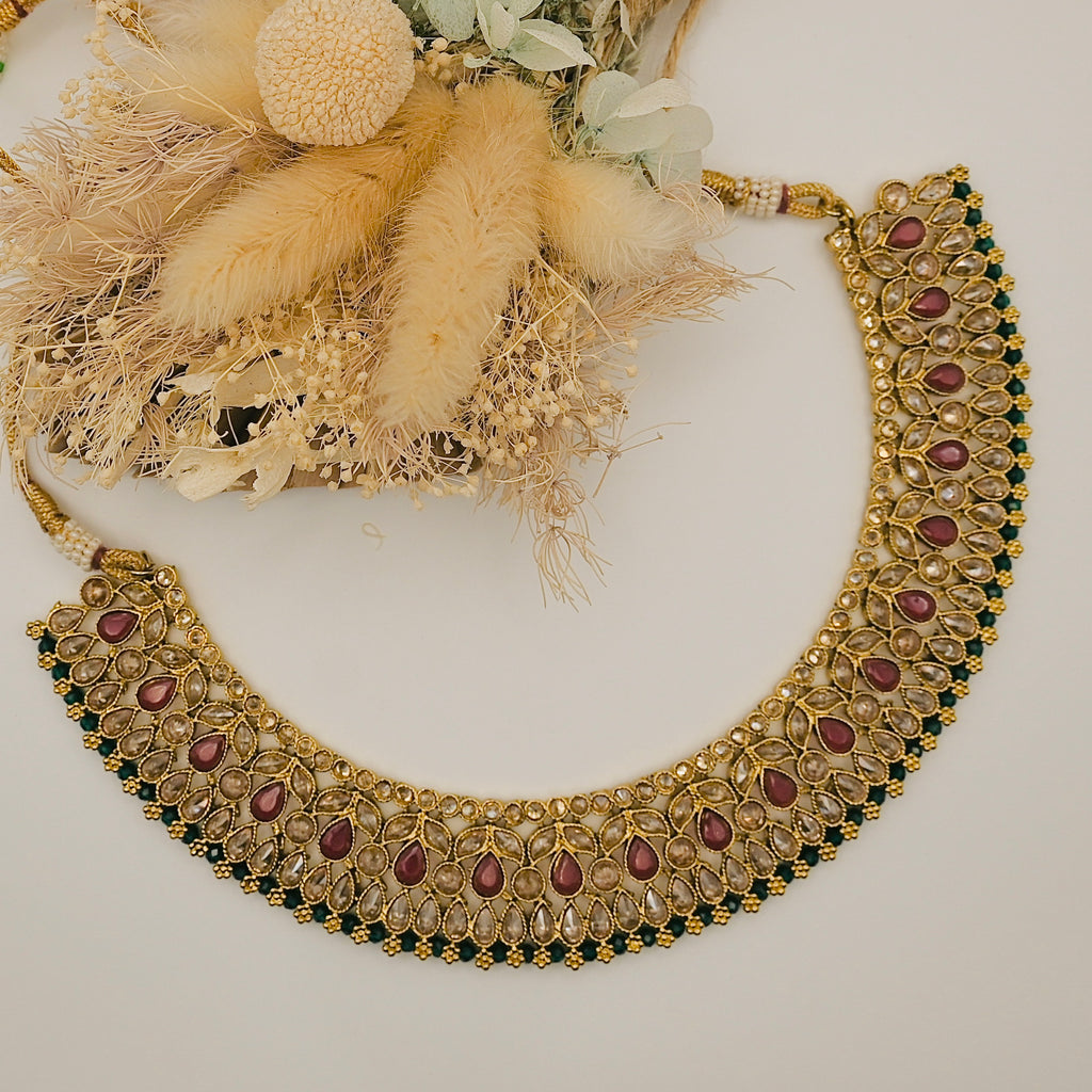 NAJLA- polki stone necklace earrings and mangtika set with maroon and green details