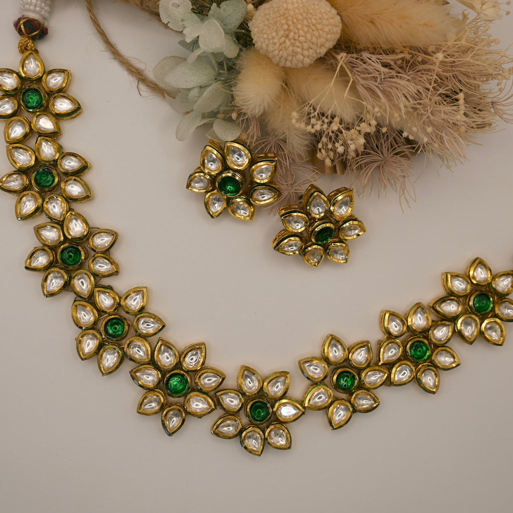 Shumi- kundan traditional green and clear stone floral shaped necklace with earrings