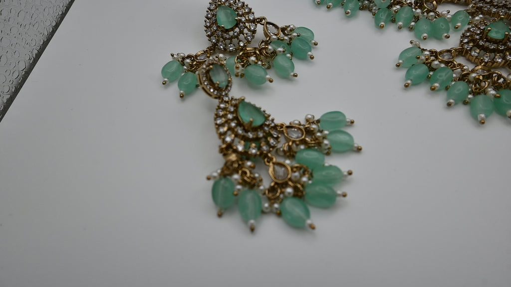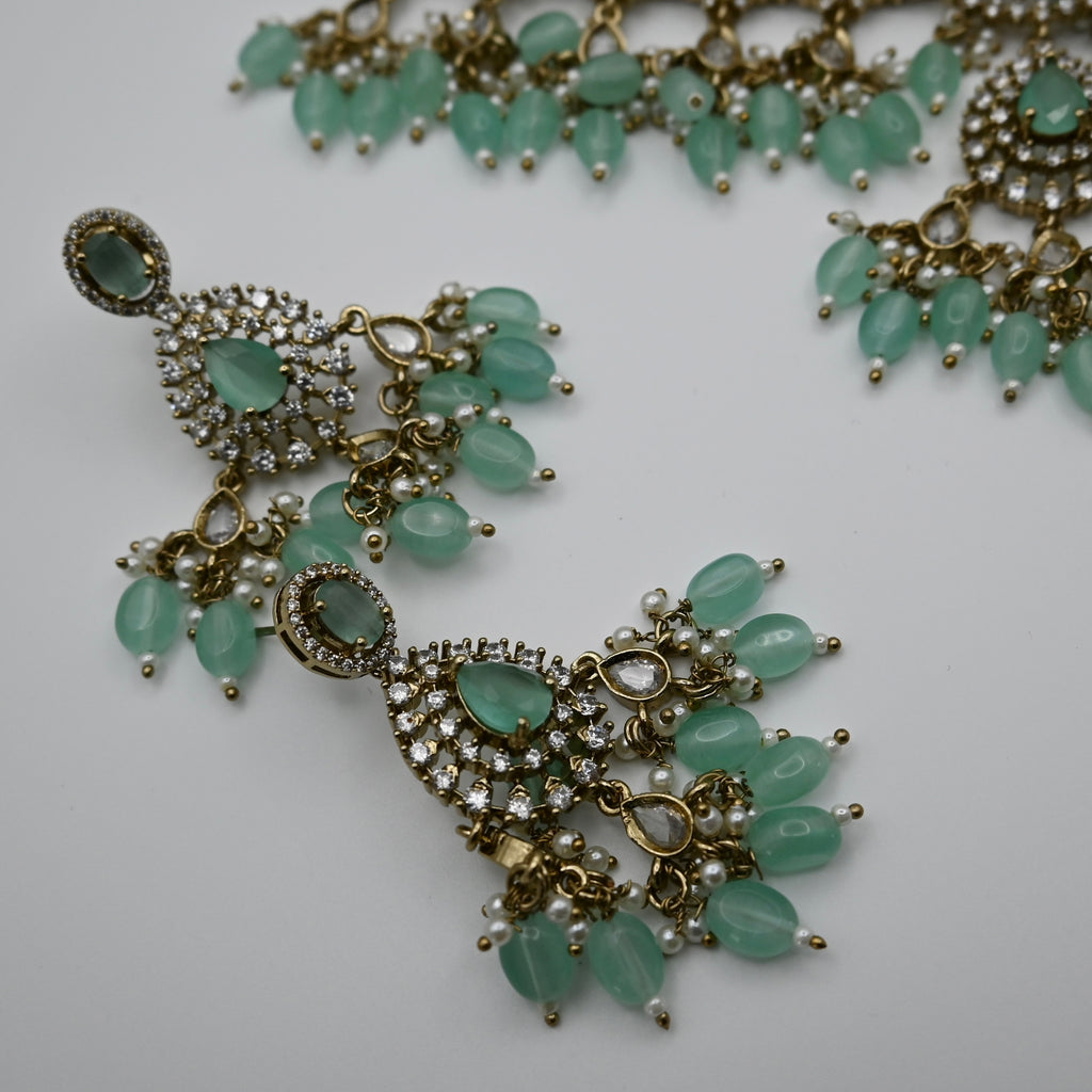 Leocadia- heavy CZ choker with mint green monalisa stone and matching earrings