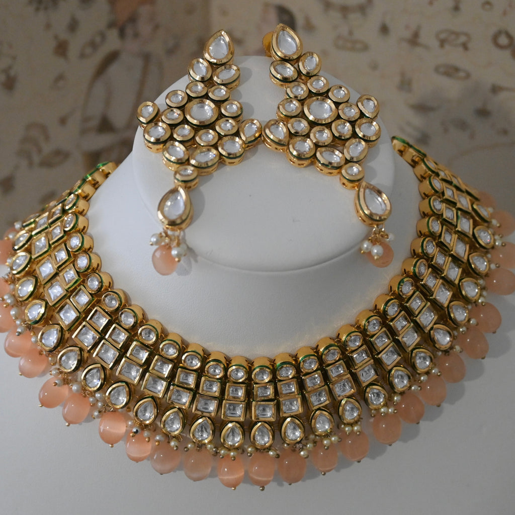 MUGHAL- monalisa stone and kundan heavy necklace and earring set in peach.